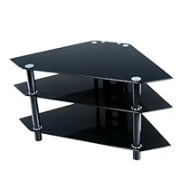 We have a wide open passage from the living room to the bay breakfast area, many windows and plants and all white oak flooring. This simple glass stand is elegant in its simplicity, and the dark bronze legs are a perfect frame for the Sony 46" HDTV. We have it placed in that passageway to the outside, and it makes a decorative statement that complements both rooms. You can assemble simply in less than 30 minutes (they even include extra caps and smaller parts); the result is sturdy, and elegant. Best money I could have spent, and it arrived two days after I placed the order. Don't worry about backing it into a corner or against a wall (unless you have a roustabout dog or young adventurous children). It would easily take a 52" flat screen as well. Walker Edison Bermuda 44-Inch Corner TV Stand, Clear/Black