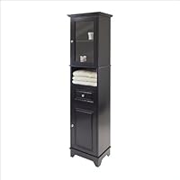 We needed a tall narrow black cabinet for a corner in our small black and white marble bathroom and this cabinet fit our requirements perfectly. However, we recommend that you buy it through Walmart and have it delivered for pick-up at your local store. We ordered through Amazon initially and the cabinet was delivered with serious damage since the packaging was completely inadequate for such a heavy item (the cardboard was broken open in several places and the damage was readily apparent.) We refused acceptance of delivery and reordered it through Walmart, where it arrived in perfect condition. It was $150 there but free delivery with pick-up at the store. There were still a few minor scratches, I assume present from the factory handling, but a black sharpie took care of those. A few black dowels to cover the holes for the screws would have been nice. The cabinet assembled without problems, the doors and drawer open and close tight and flush. We put toilet paper, spare hand towels and a few toiletries in the drawer and cabinet below; display items behind the glass door above. The cabinet is simple with nice detailing on the bottom and top and looks good for the price.