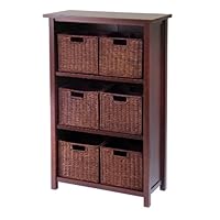 Winsome Wood Milan Wood 4 Tier Open Cabinet in Antique Walnut Finish and 6 Rattan Baskets in Espres